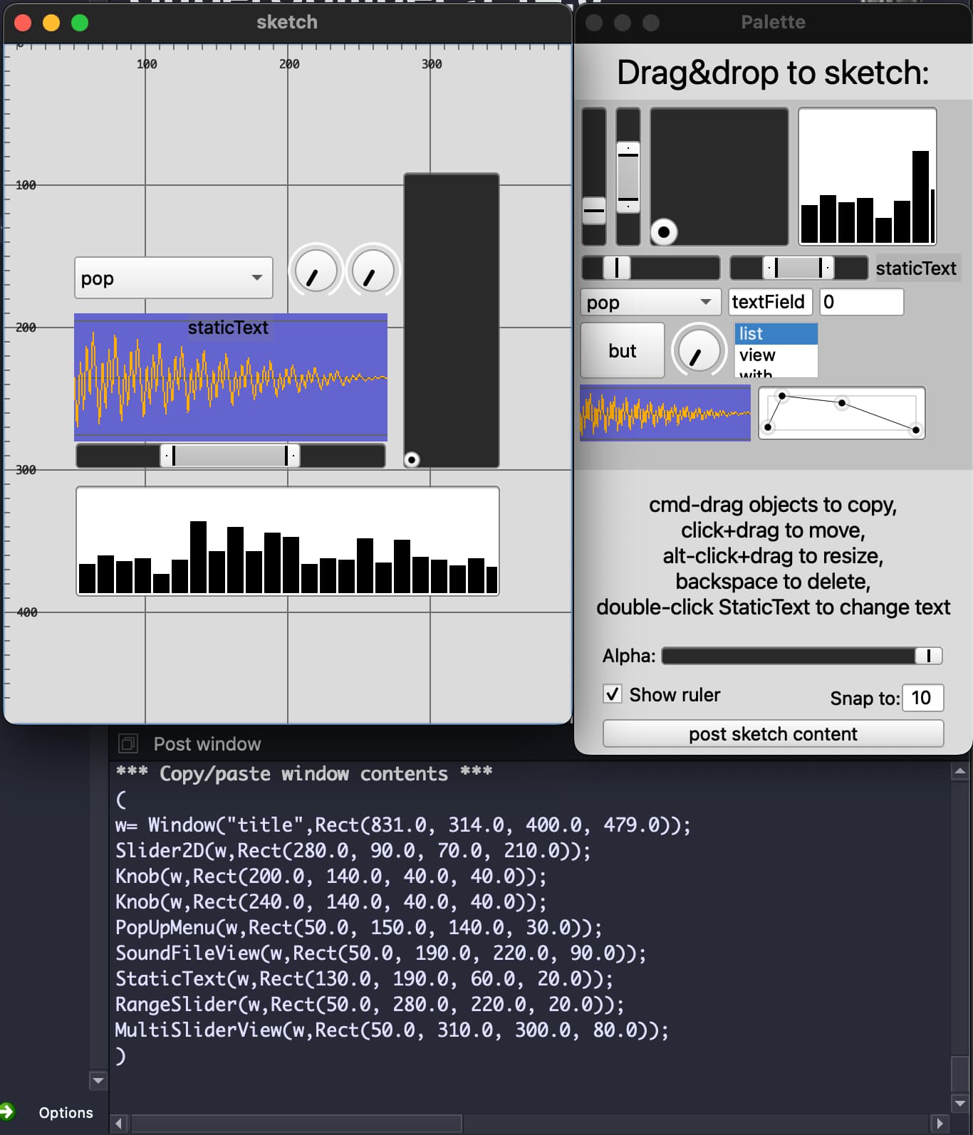 (a.class.asString++"(w, "++a.bounds.asString++")").postln;