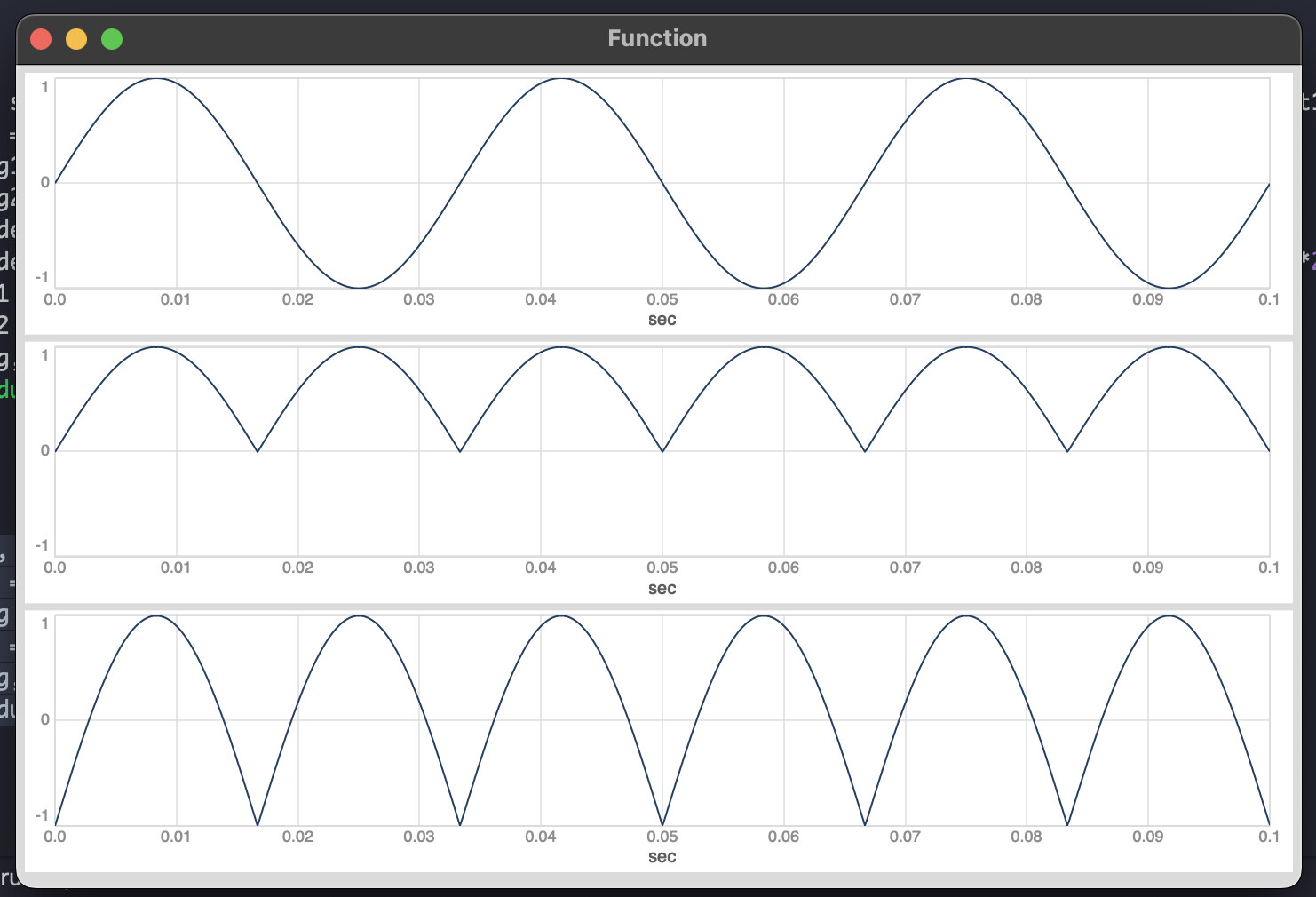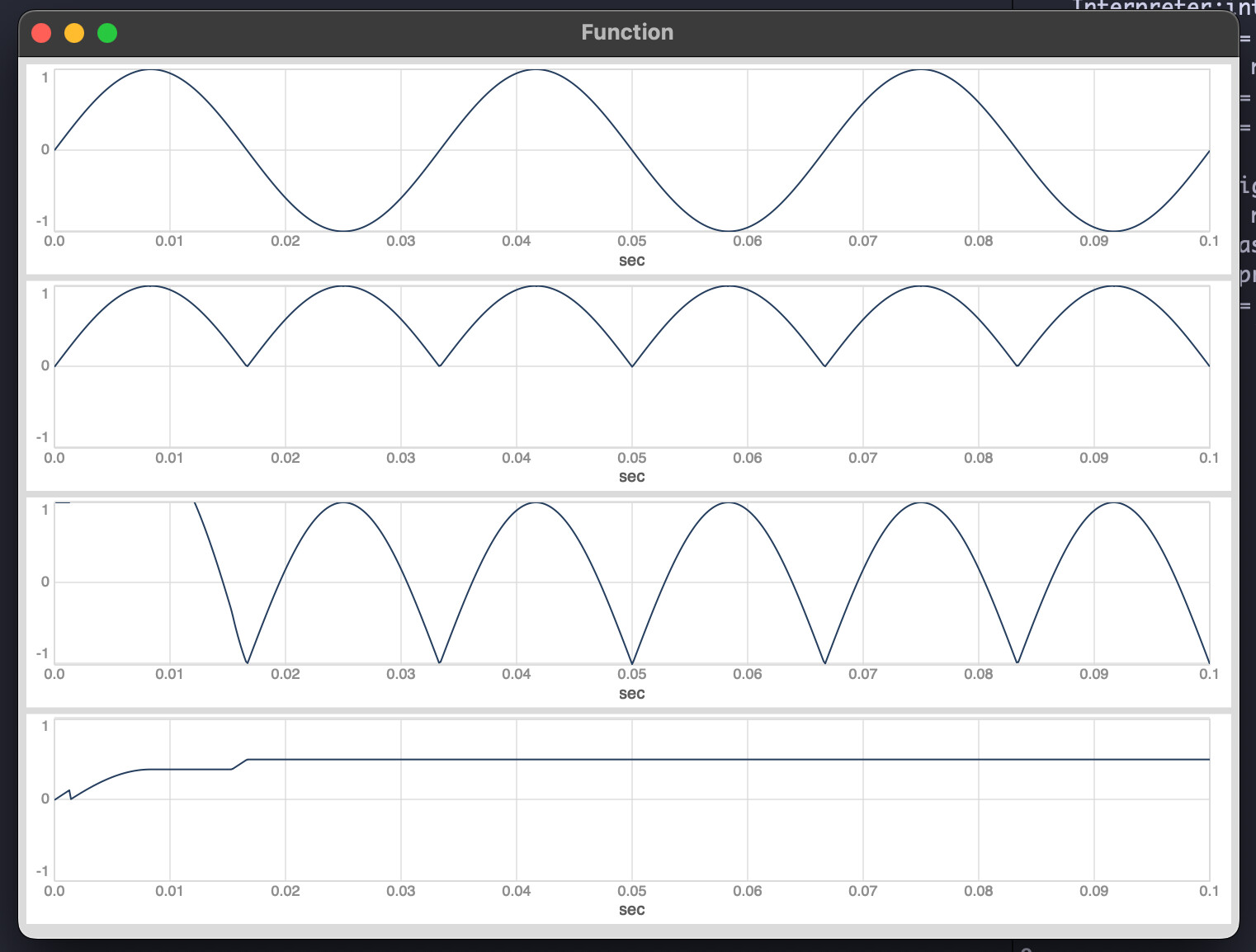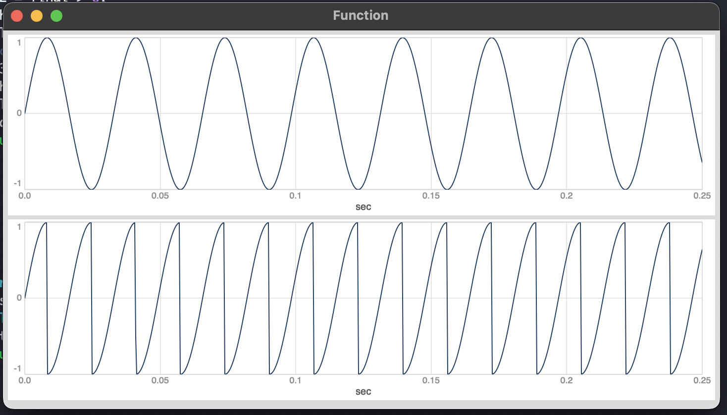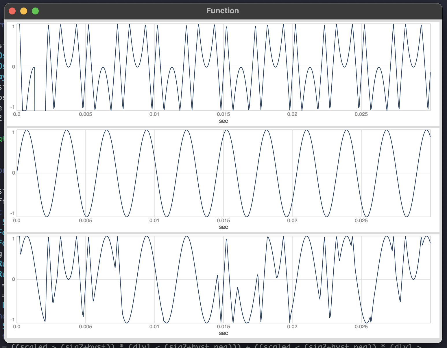 I was playing with different waveform strategies I used on analog synths to splice together a couple different waveforms into one new waveform. In an analog synth, a comparator with a voltage reference input is used to generate a trigger signal that drives a switch, often with a flip flop involved.