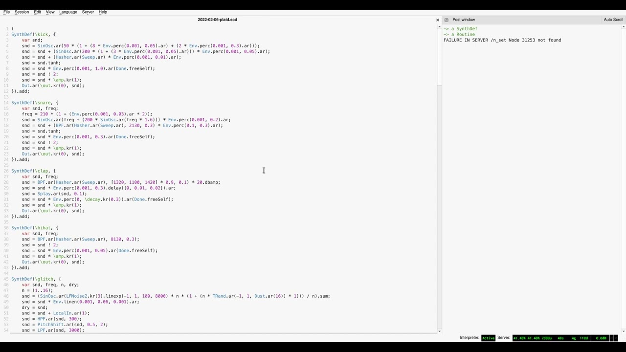 This is one of few major patches I’ve written where I’ve made the full code available. Enjoy: Generative SuperCollider patch · GitHub