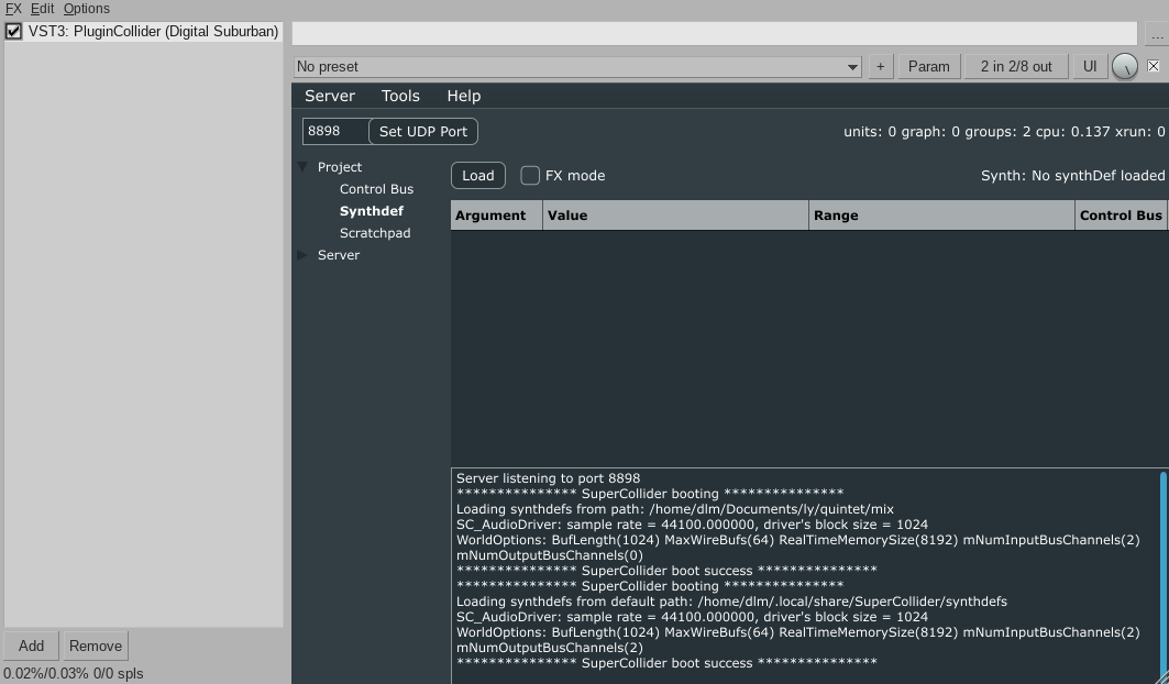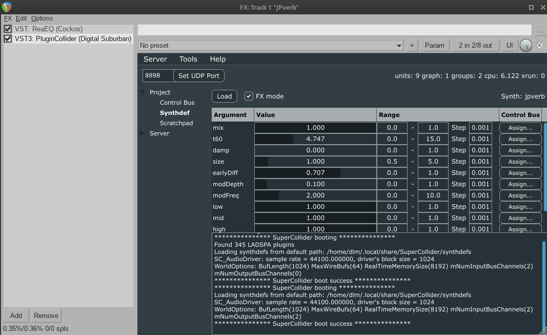 ( SynthDef(\jpverb, { |mix = 1, t60 = 3, damp = 0, size = 1, earlyDiff = 0.707, modDepth = 0.1, modFreq = 2, low = 1, mid = 1, high = 1, lowcut = 500, highcut = 2000| var sig = SoundIn.ar([0, 1]); var rvb = JPverb.ar(sig, t60, damp, size, earlyDiff, modDepth, modFreq, low, mid, high, lowcut, highcut); Out.ar(0, XFade2.ar(sig, rvb, mix * 2 - 1)) }).writeDefFile("~/Documents/you/dont/need/my/actual/path".standardizePath); )- ^^ Note: For effect usage, incoming audio is on the hardware input busses (
