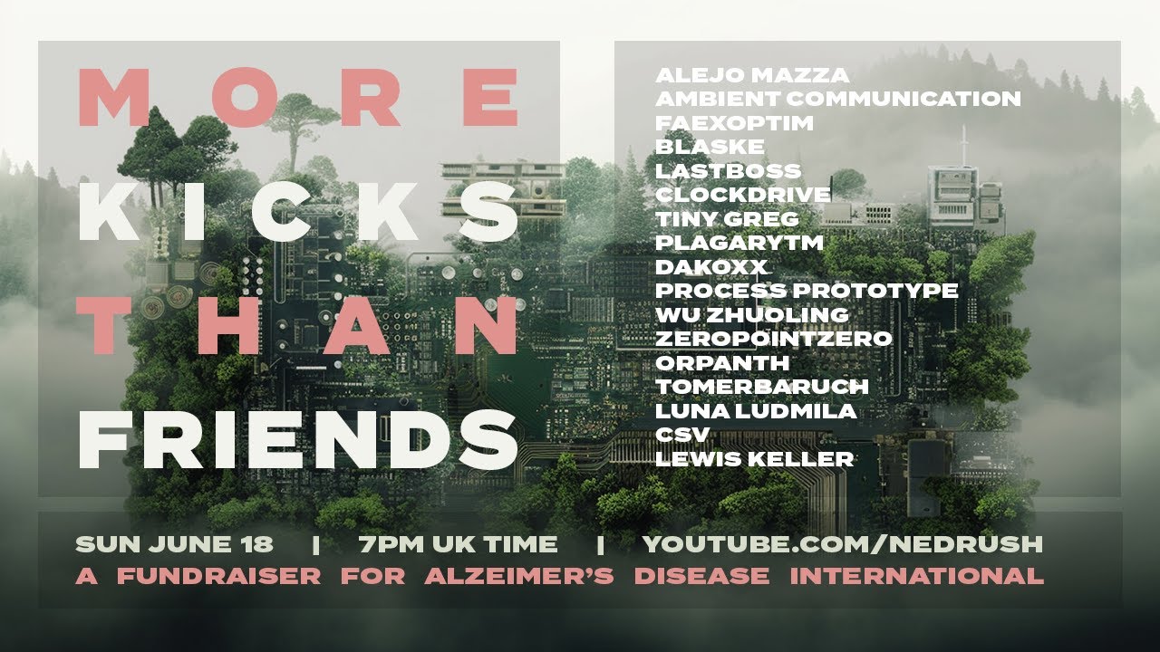 Weekend after next (June 16-18), Ned Rush (who uses That Other Audio Programming Environment Which Interfaces With Ableton) will host an Alzheimer’s charity online music festival under the More Kicks Than Friends banner.