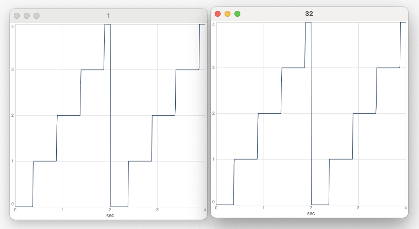Does anybody know what could be going on? I have struggled quite a lot with getting the Select.ar-lookup right and preventing the jumping output on the first plot and can’t wrap my head around why this should have anything to do with the blockSize in the first place. Any hints would be greatly appreciated! ![]()