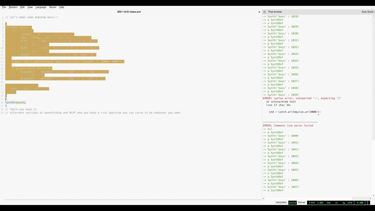 @retroriff asked me to break down a patch I made for growls in SC, so I made a video demonstrating how I build this kind of sound up from scratch.