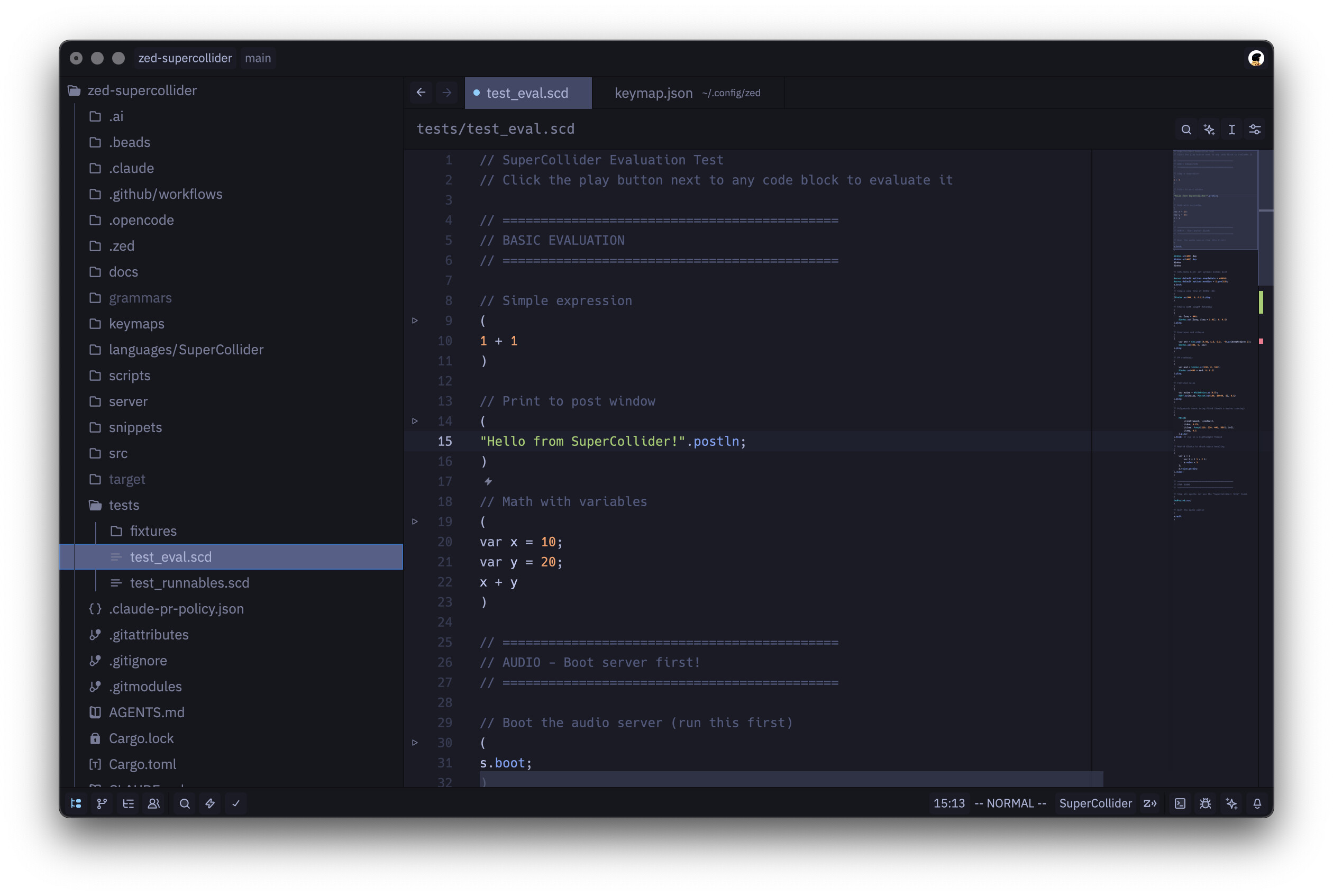 - Editor ↔ sclang integration with keyboard shortcuts plus gutter actions for evaluating code (nice touch—thanks Zed)